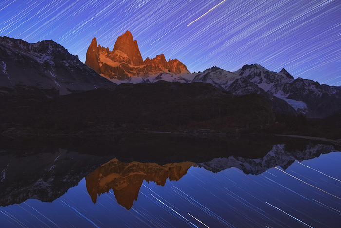 During this expedition, I also made an interesting discovery about the night sky in Patagonia. One night, I camped in Capri and wandered around the lake by myself. The sky was crystal clear, full of blazing stars, and the lake was soothing and still. In front of me was the Fitz Roy peaks. This peaceful atmosphere motivated me to take a star trail picture of this enchanting night mountain scenery.