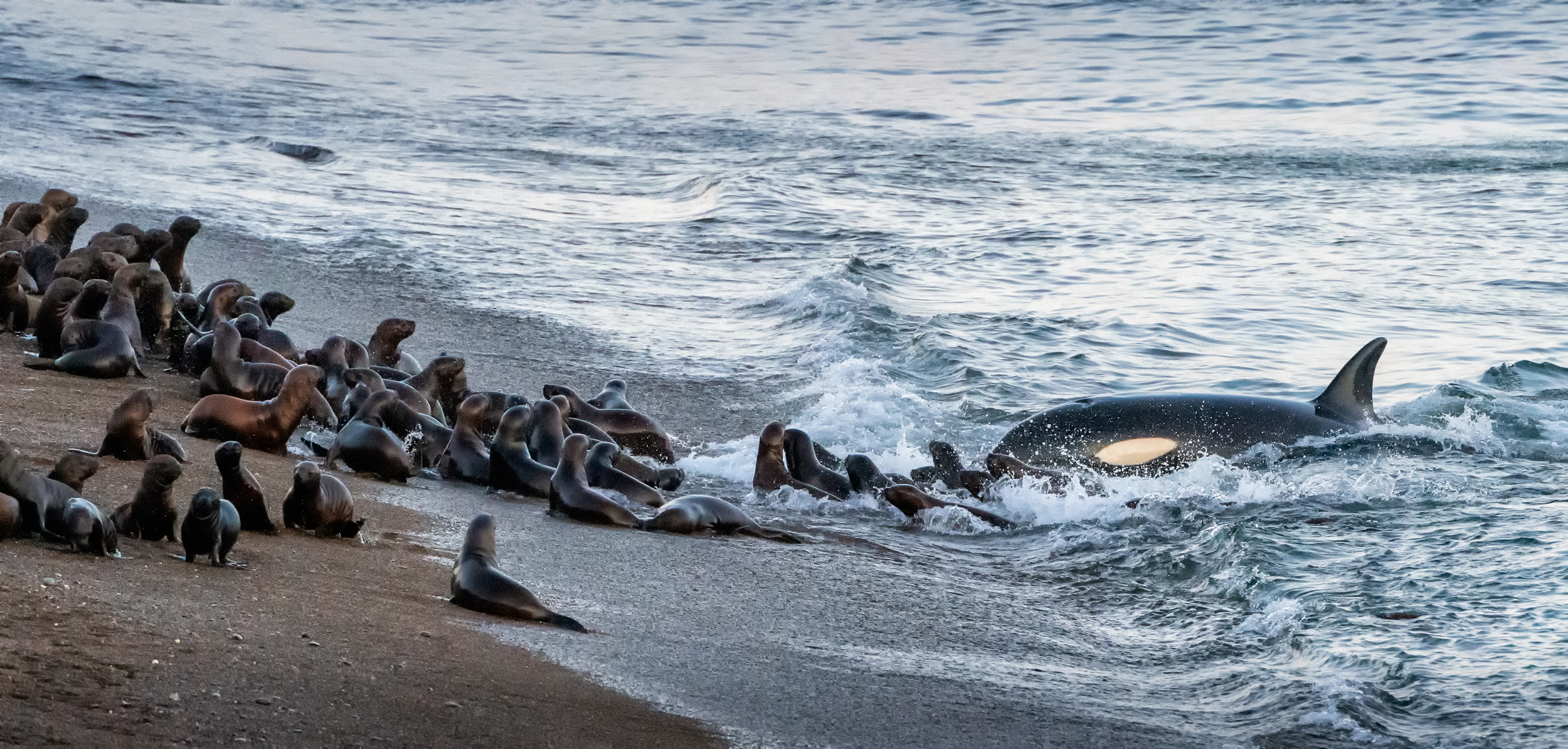 ‘Morning attack- A pregnant orca attacks two sea lion pups on the beach in the early morning’